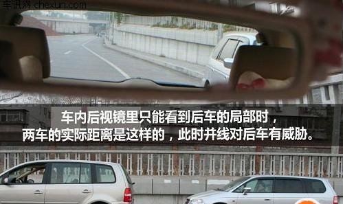 第三种状态:如果后车身影只有少部分出现在后视镜的边缘,说明两车距离很近,此时并线会对后车构成威胁。