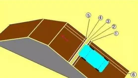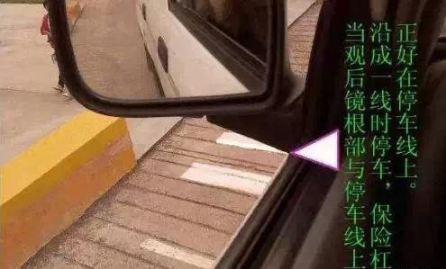 2、观察左后视镜,当1线和左后视镜下沿与眼睛成一线时,踩下离合、放开油门,当3线中心和左后视镜下沿与眼睛成一线时,踩刹车、拉紧停车驻动器,停车到位;
